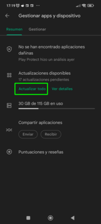 Por su parte, en Android las aplicaciones son actualizadas a través de las aplicación de Play Store si no se ha instalado ninguna ROM personalizada, ya que, de ser así, posiblemente la tienda de Google haya sido reemplazada por otra como F-Droid. Pero en caso de mantener la implementación de Android suministrada por el fabricante del smartphone, los pasos a seguir son abrir la aplicación de la Play Store y hacer clic sobre el icono del usuario en la esquina superior derecho para luego hacer lo mismo sobre “Gestionar apps y dispositivo”. Una vez se haya accedido a la sección hay que pulsar sobre “Actualizar todo”.