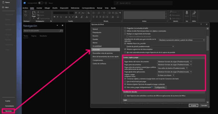 De modo que, si siempre vamos a querer que se haga con el formato del texto de destino (esto es, el comportamiento contrario al habitual), podremos indicárselo al procesador de textos de MS Office accediendo a ‘Opciones > Avanzadas > Cortar, copiar y pegar‘, tal y como se indica en la imagen inferior: